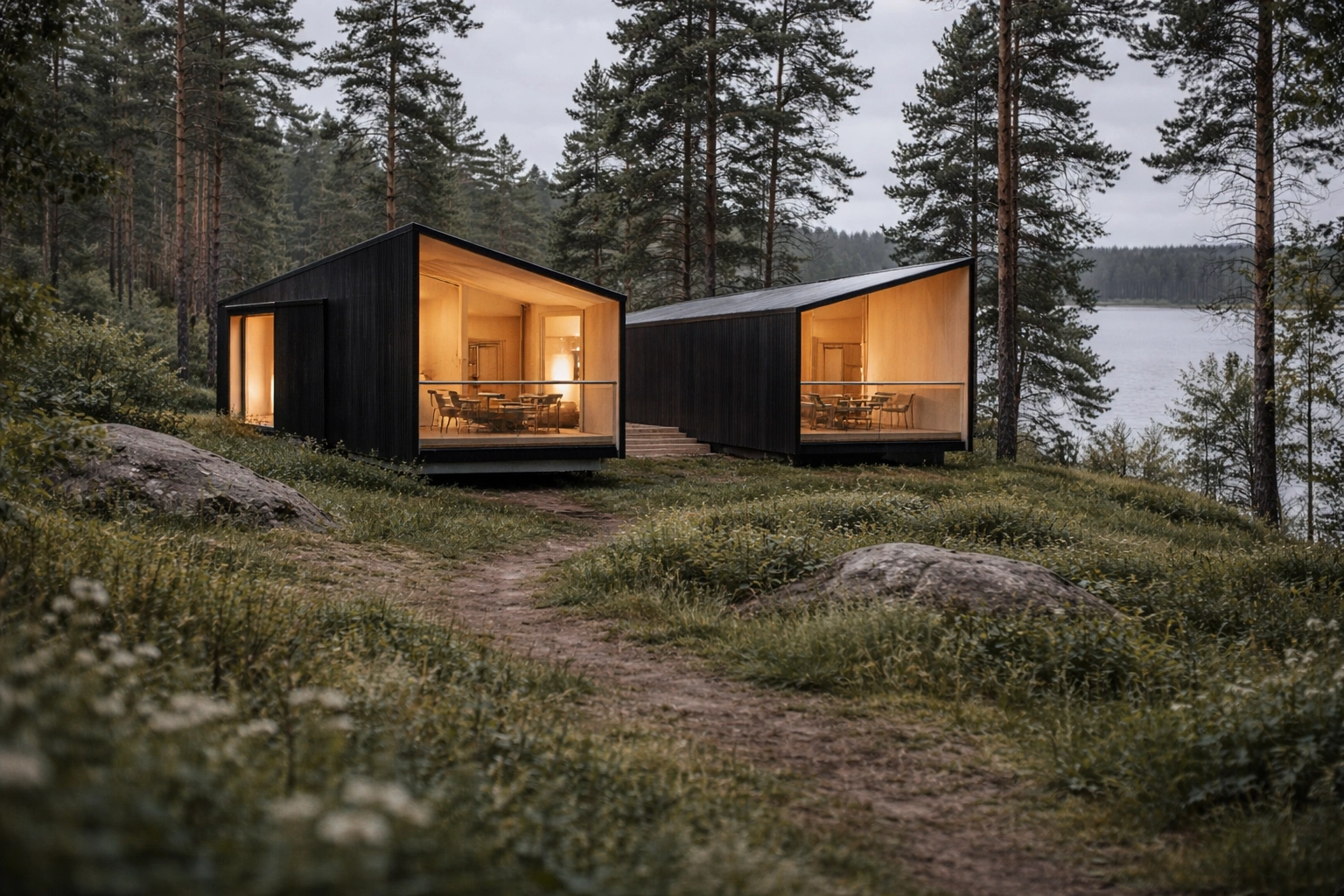 KROMA is a modular CLT villa system built for nature tourism operators who want to create something permanent without building from scratch. Each unit arrives in three prefabricated modules, is lifted onto a minimal pre-installed foundation, and is operational within days. Two configurations, one system. As a hospitality product, each module houses three independently rentable suites — two studios and one larger suite — arranged in a U-shape that gives every room its own view while maintaining full privacy between guests. As a single house, the same volume becomes a complete residence for up to six people, with two bedrooms, kitchen, living area, bathroom, and sauna, with the U-shape creating a private courtyard between the sleeping areas. CLT exterior cladding blends into forested and lakeside settings. Warm natural materials and stained timber inside create an atmosphere of quiet luxury that works year-round. Keyless automated check-in and ready-made furniture included. Scalable — add modules as your concept grows.